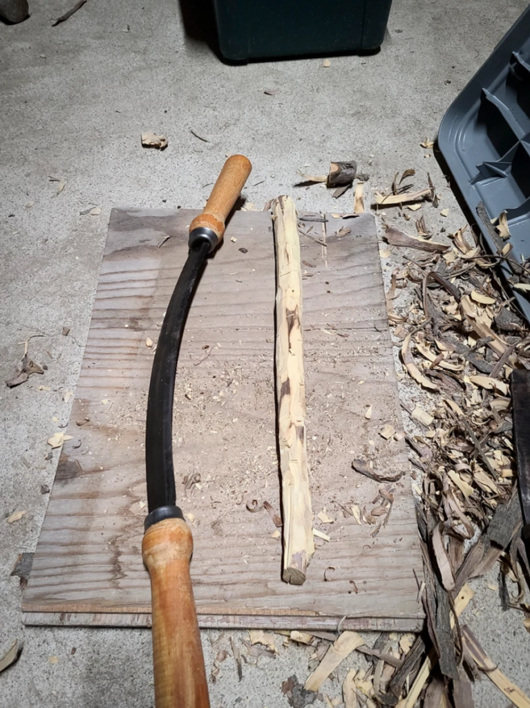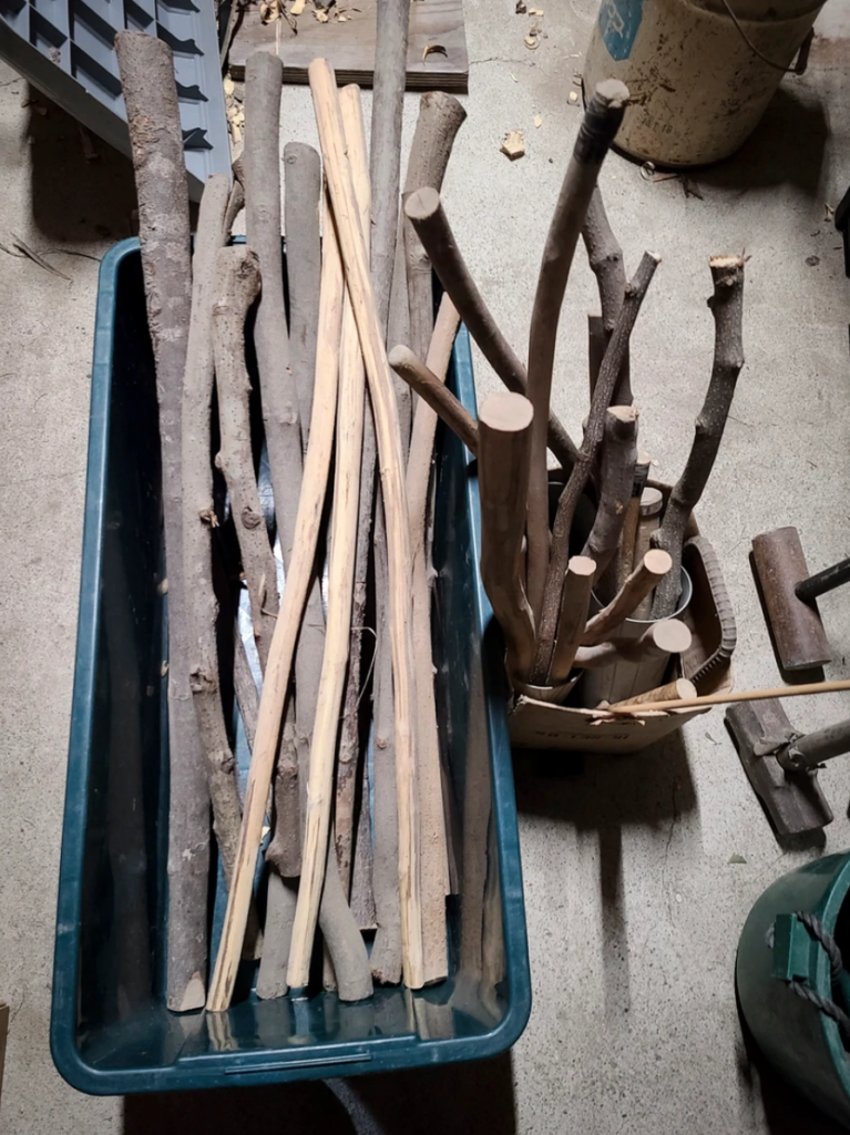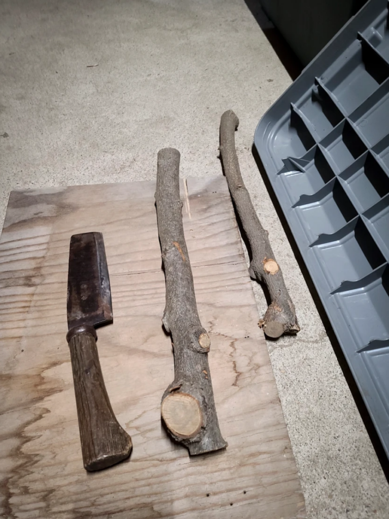 代表曰く、交換する柄は剪定で出る枝をストックしておくとのこと。最初にナタで大きく削ってから、銑(セン)という道具で木の皮を削り丸く仕上げていくそうです。