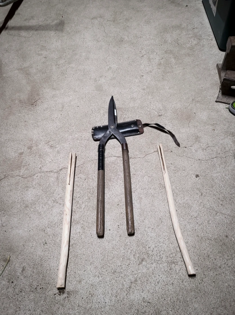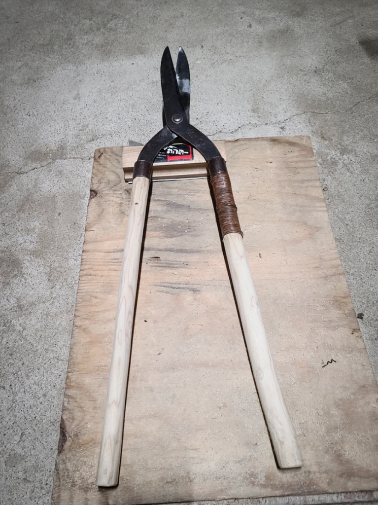 「先日、たまたま新入社員の使っていた刈込ハサミの柄が折れてしまい直し方を教えてあげておりました。自分の道具に関しては、大抵のものは自分で直せないと自分のものと言えない…壊れたというのは、それを直しなさいという思し召しだよ、というように伝えております。また、たまたま自分の柄にヒビが入り直すことになった為、なかなか一般の方にご覧いただく機会も少ないと思い、写真にとって記録していた次第です。」