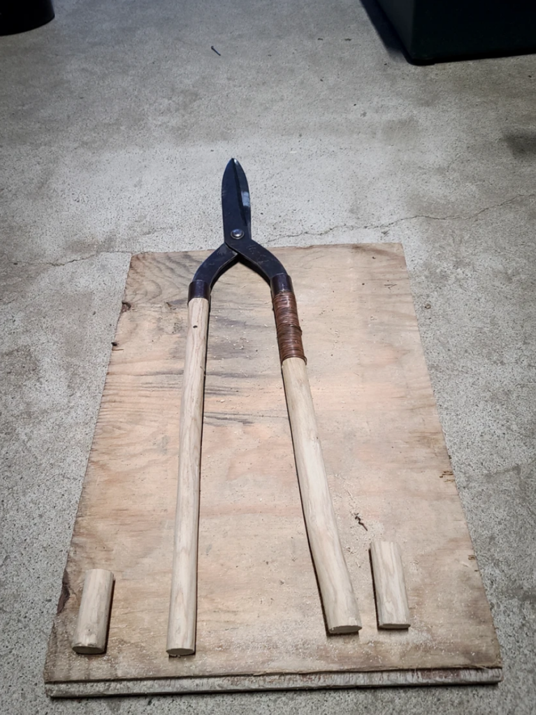 「刈込ハサミは、本来の持ち方として右手と左手では持ち方が違う…という特徴がございます。刈込ハサミの柄を直すとはいえ単純に真っ直ぐ仕上げるのではなく、自身が持ちやすいように仕上げなければ、道具としての機能性を失ってしまいます。木の選定から削り方まで、丁寧に進めていきます。」