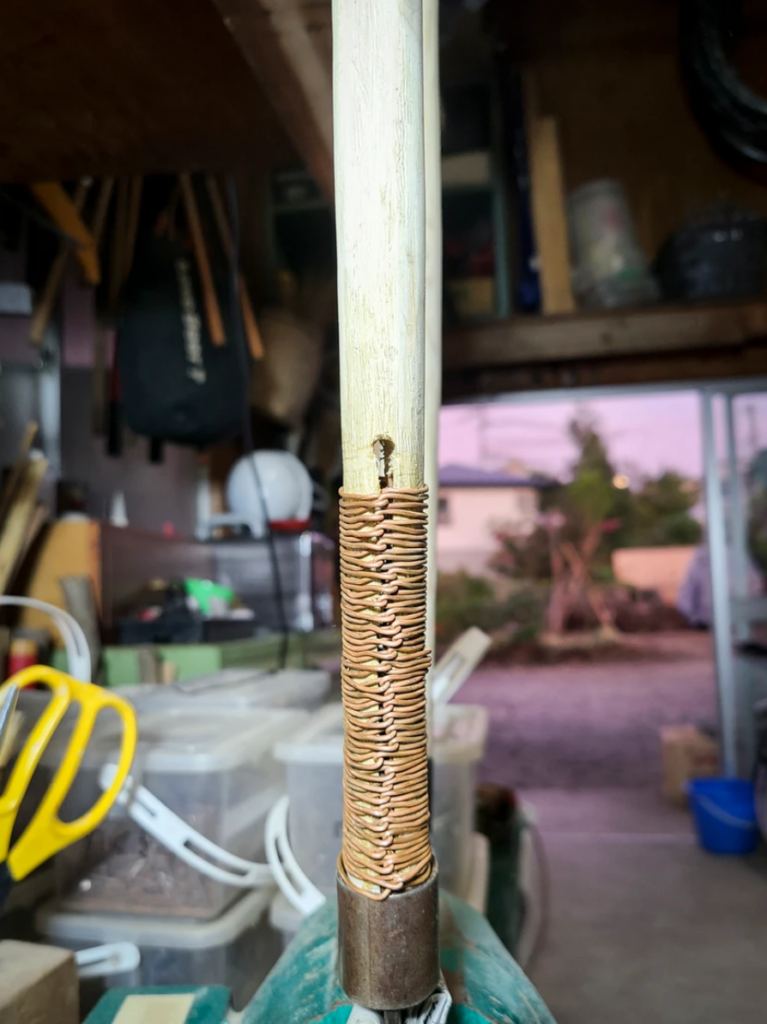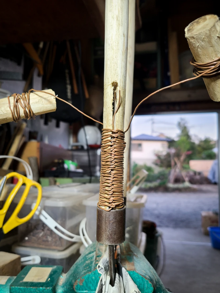 「最終的には補強の目的で銅線を巻いていきました。刀やナイフの持ち手を巻くときの滑り止めの巻き方で、耐久性と美的観点から銅線で巻いていきました。