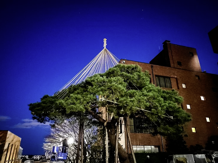 通常ですと50本前後の縄を使うとのことですが、今回お写真で拝見した13mのボンデン(雪吊)では、その大きさと合わせて124本の縄を使われたそう。