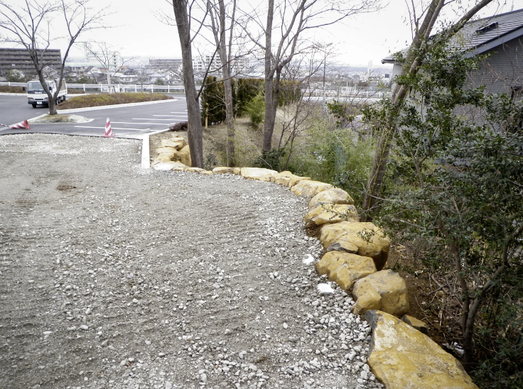 「例えば、今回の現場ですとサクラの木は切らないように駐車場を増設して欲しい…というご依頼でした。今回石積みを採用したのは、石だとカーブを作りやすくまた水捌けも良いという点と、サクラの根へのダメージも最小限に抑える事が出来るという点からです。