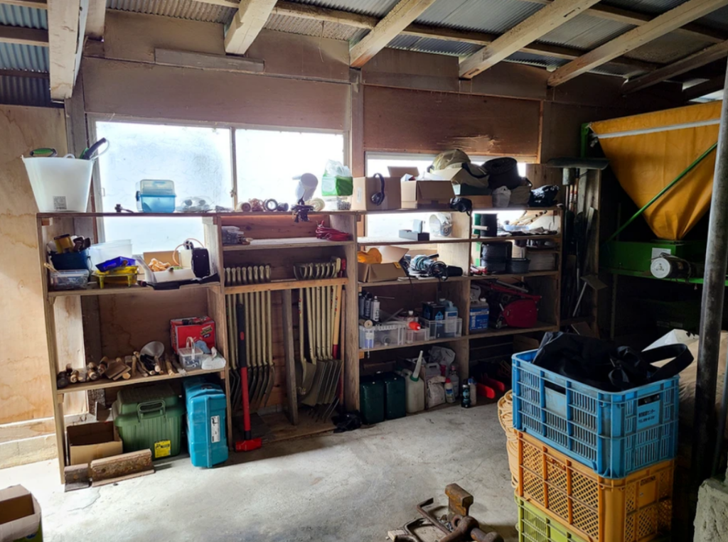 棚は、スコップなど長物をそのまま収納できるようにするなど代表自身「使いやすいように」と設計されたとの事。資材は、現場で使用した古いコンパネをサンダーで磨き再利用しています。