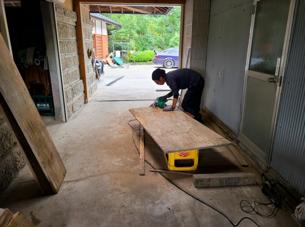 現場で古くなったコンパネをサンダーで磨き ある程度キレイにしてから使える部分を使い棚にしていきます。