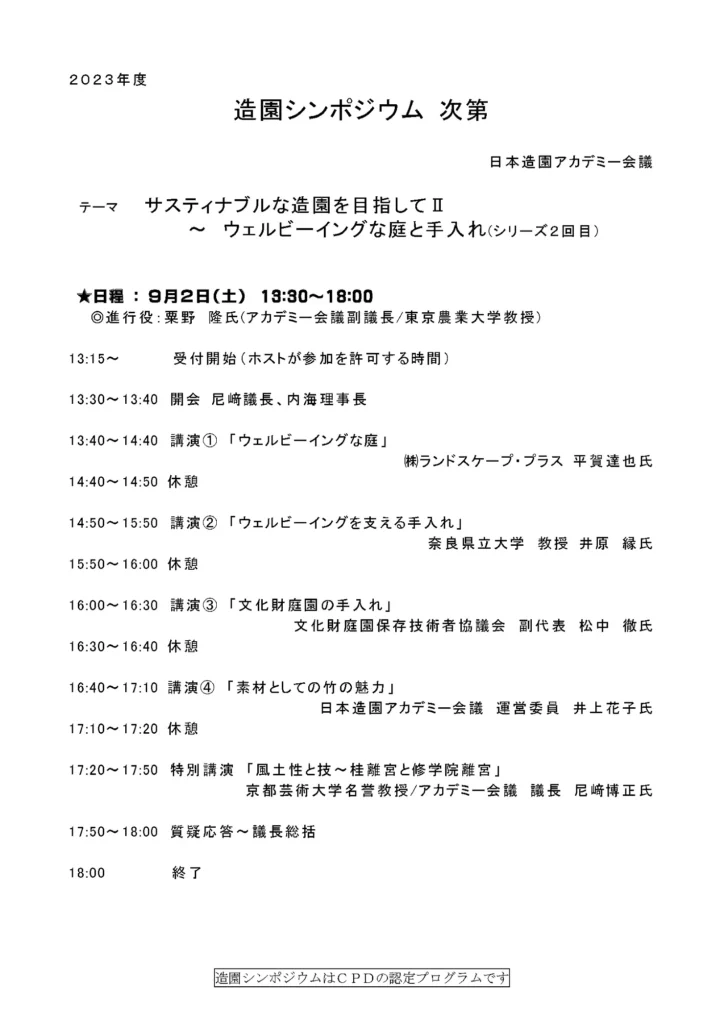 日本造園アカデミーが主催する「造園シンポジウム」は、造園にまつわる有識者の方々が登壇され、現代における庭づくりに必要な物事やこれから必要とされるであろう造園のあり方などを、ご自身の手がけられたお仕事をはじめ、研究対象などから紐解いていく…といった内容となっております。