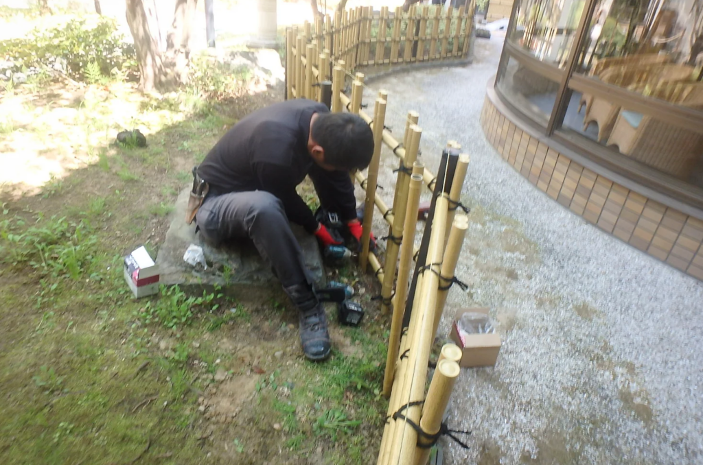「土台をコンクリートにし、塩ビの人工竹垣を作成しました。近くで見るとどうしても‘作り物’の印象は否めませんが、遠景や水場のような環境ではすっきりと綺麗に見えてくれる事もございます。これに関しては、環境や施主様のご意向に合わせて適宜ご提案して参ります。建仁寺垣根は柱を壊したところを最小限度で収められるよう、基礎を設置致しました。人工竹垣は針金ではなくドリル留めが基本ですので、‘竹垣の設置’とはいえ電動工具が活躍する現場です。」