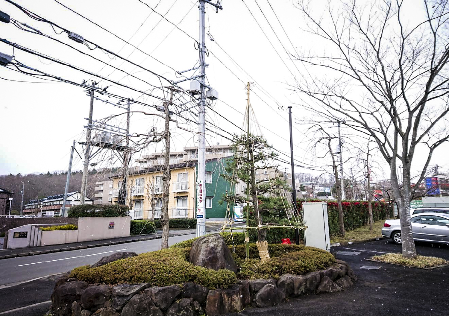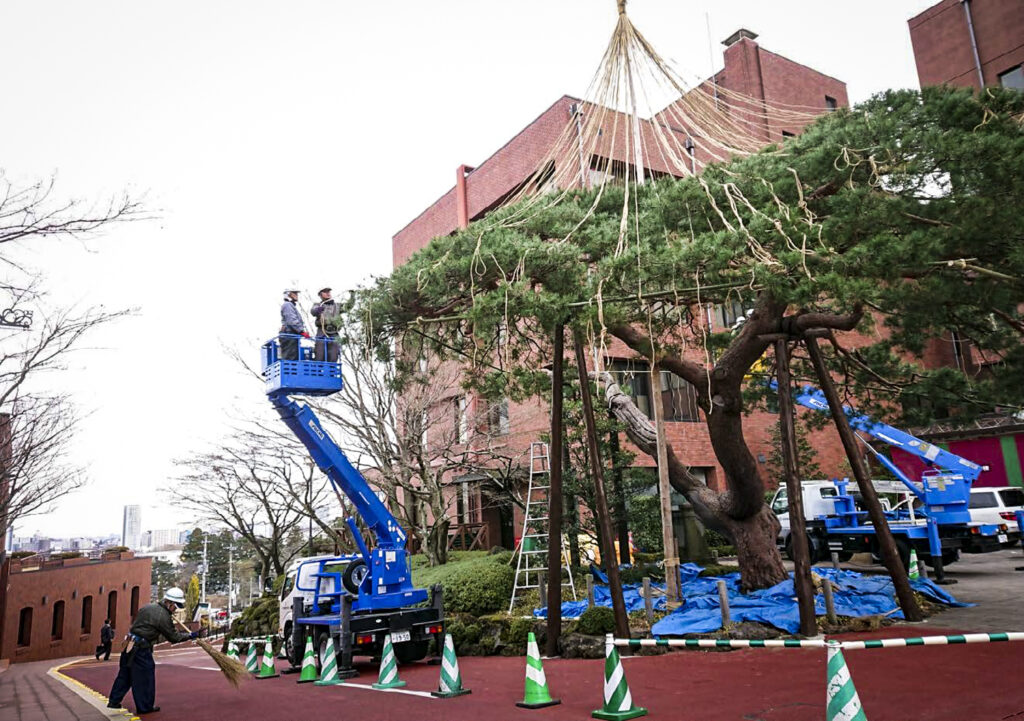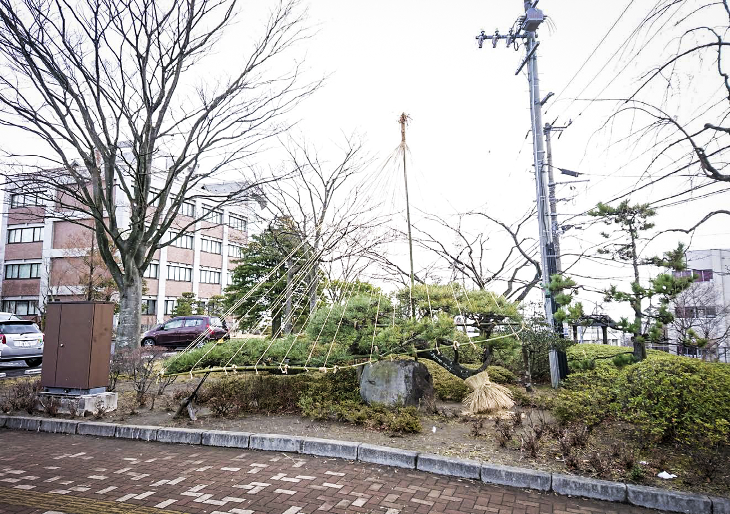 「基本的に雪吊りというのは、雪の重みで枝が折れないようにする為のものなのですが、縄でさまざま形の表現を変えることもできますので、中には装飾的な雪吊というのも存在します。清水園のある宮城は雪が少ないので、実用的なものと装飾的なもの両方ございますが、お隣の山形県などは雪が多いので実用的なものがほとんどです。形も異なりますし、場合によっては板で囲ったり…というものもございます。」