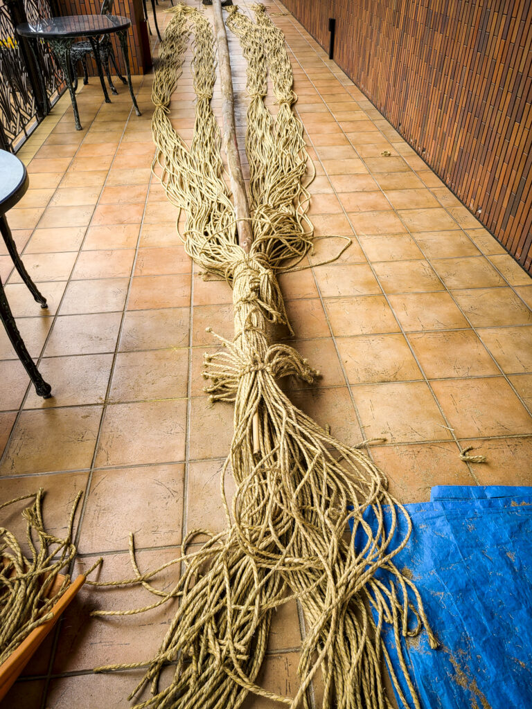 13mの丸太に4gの縄が16玉使用しているので、大体200kgぐらいあるので、 人力で移動するのはとても大変です。