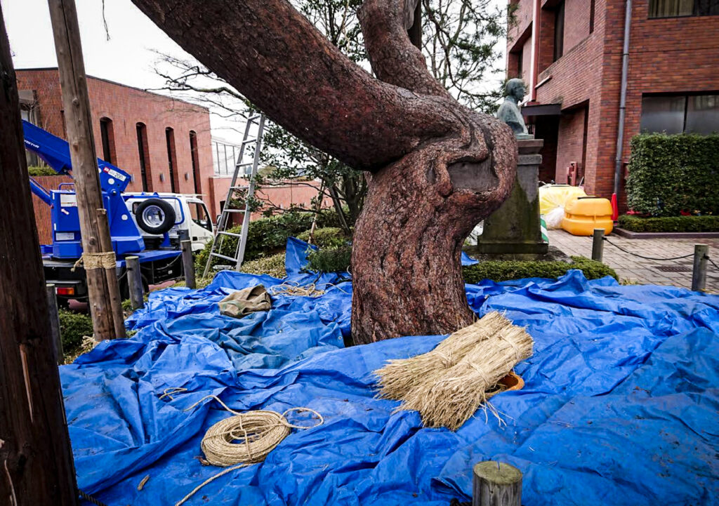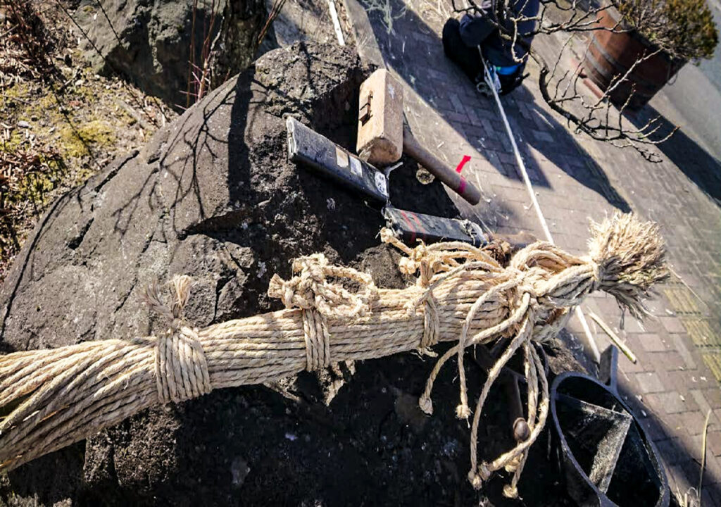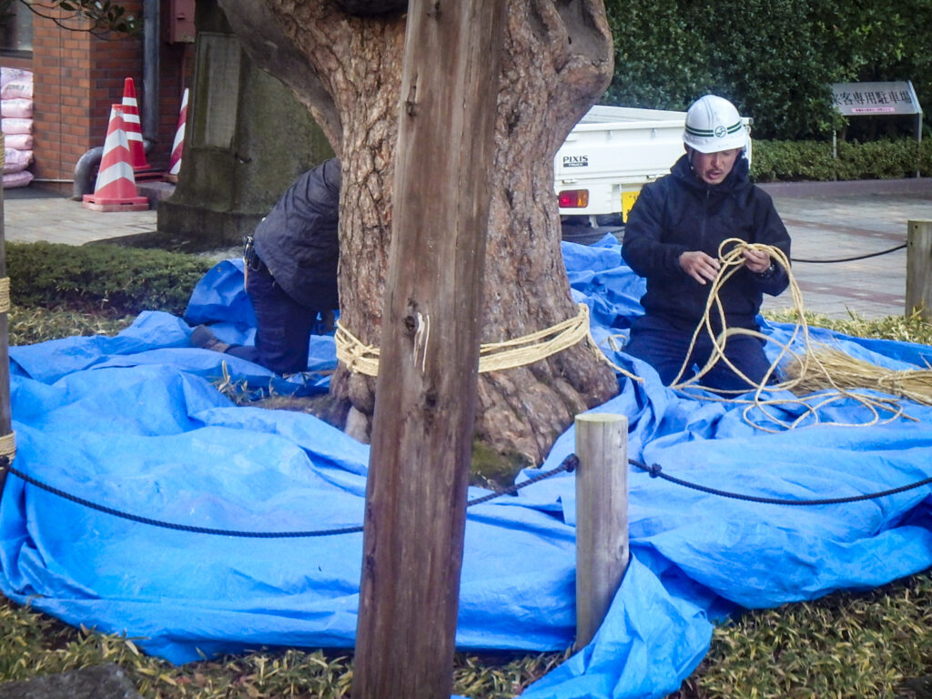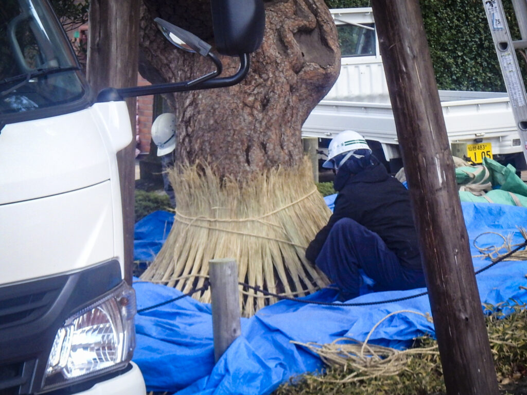 根巻する際はこちらの木の 場合かなりの太さになので、あらかじめワラを置いて準備します。 また地面に直接置くとわらが、汚れるので、養生して作業します。
