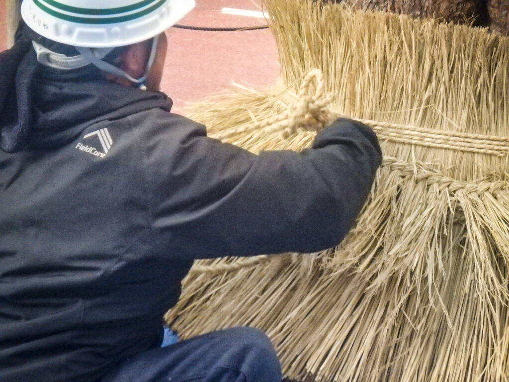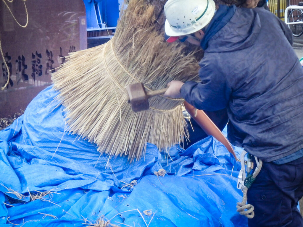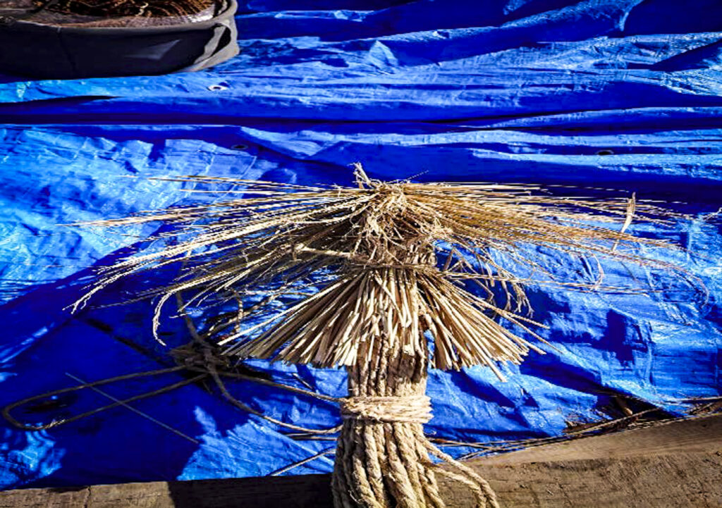 時にはワラを叩きつぶしてさらに絞って固定します。
