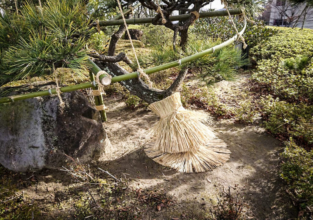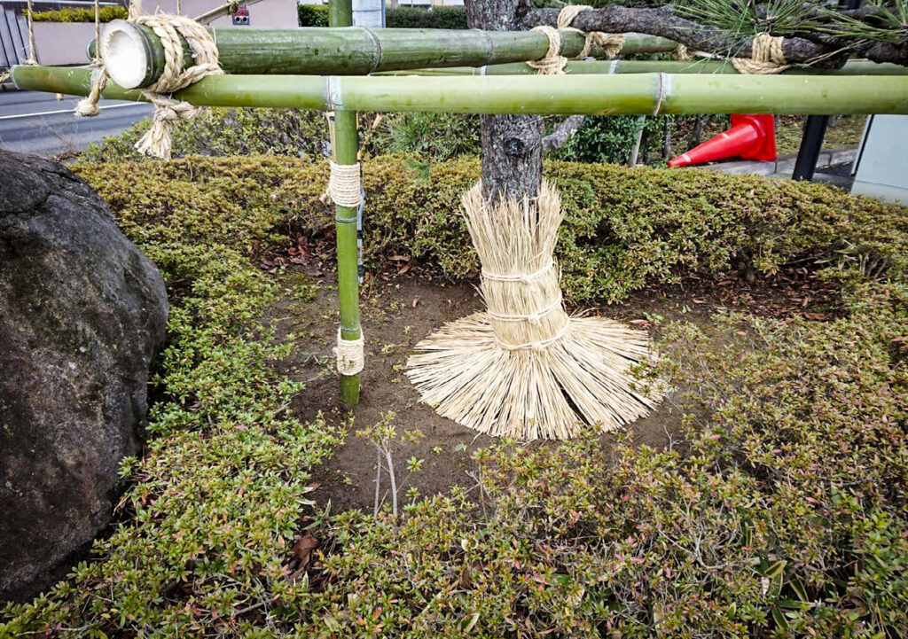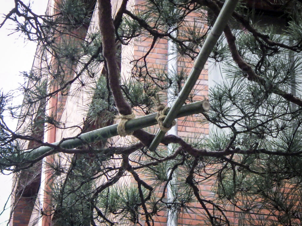 こちらは曲がっている松なので 枝や幹を全体的に支えられる 様に要所要所に結んで支えています。 ボンデン上部飾りは一番シンプルな飾りです。