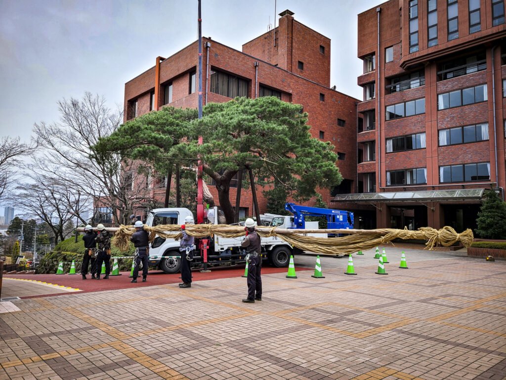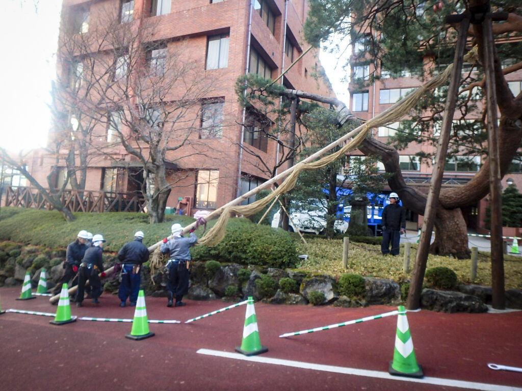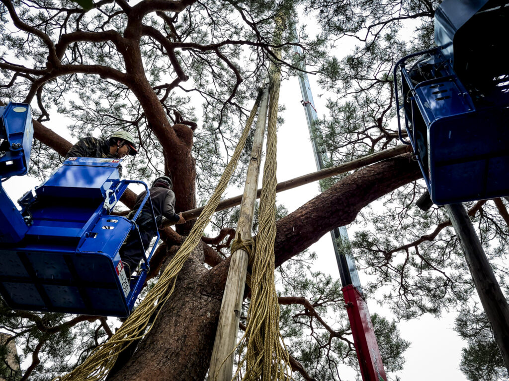 樹高4m松に24本で 割り竹を回し全体的に吊っています。