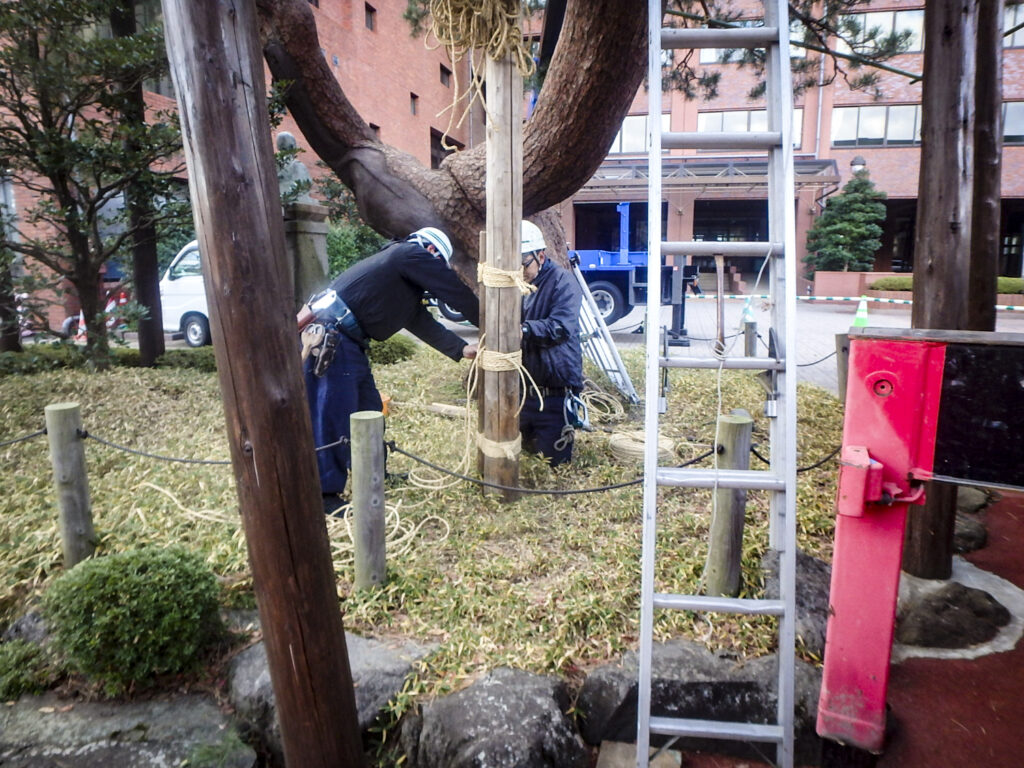 柱の固定が終了したら今度は結束部に向かって縄を投げて行きます。 風がふいていたり、障害物が あると、投げづらいので大変な作業です。