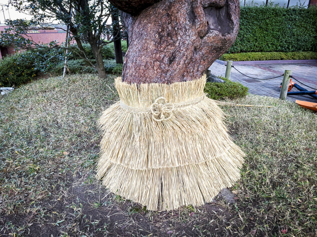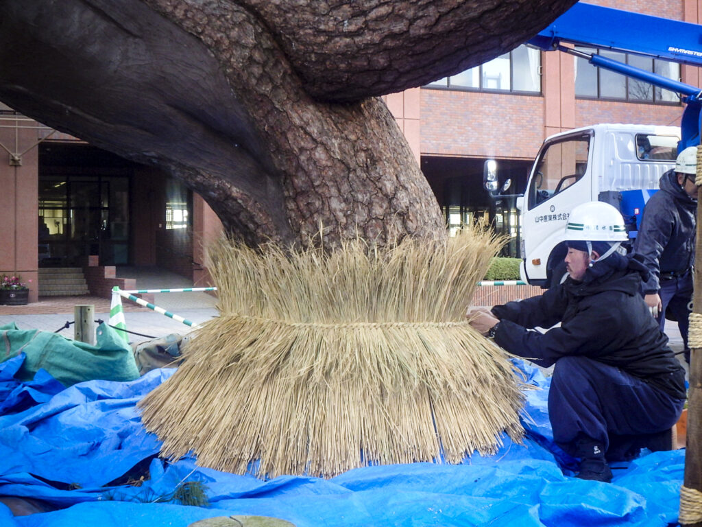 幹の部分には虫取りの為と防寒のためにワラを巻いています。 装飾の部分が強いので、キレイに巻いていきます。こちらは2段巻の例です。