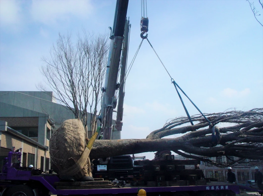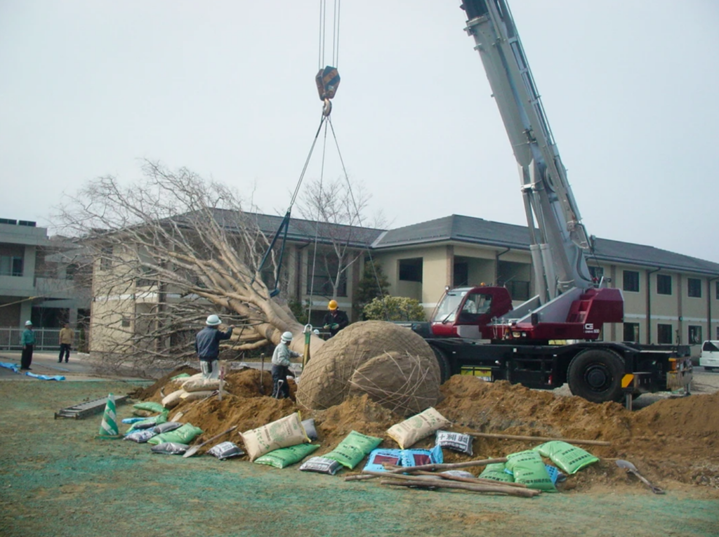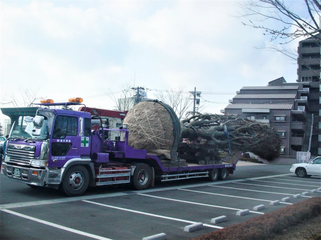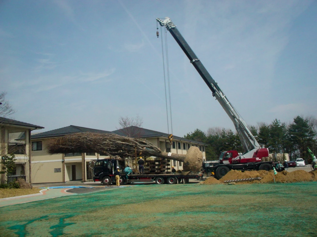 植栽場所に運搬されました。今回は65tクレーンでの植付になります。