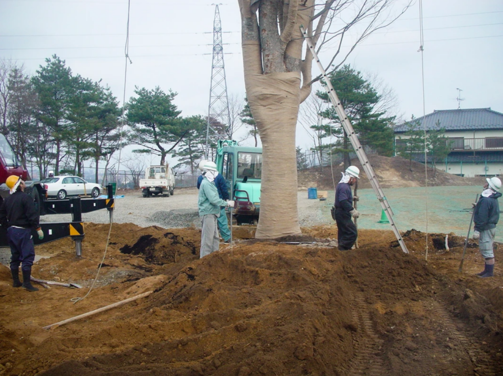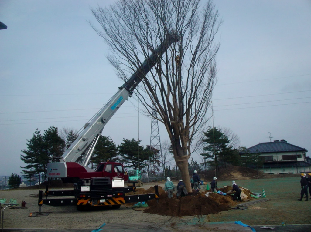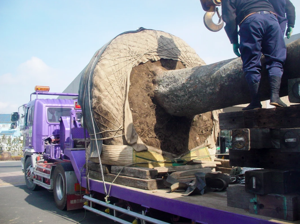 こんなに大きな木は後にも先にもない…と思うほどに大きな木でした。もともとは福島県の中島村というところで生育されていたケヤキで、全長およそ25m。荷台が18mトレーラーで運んだとのことですが、それでも8mははみ出てしまう大きさです。