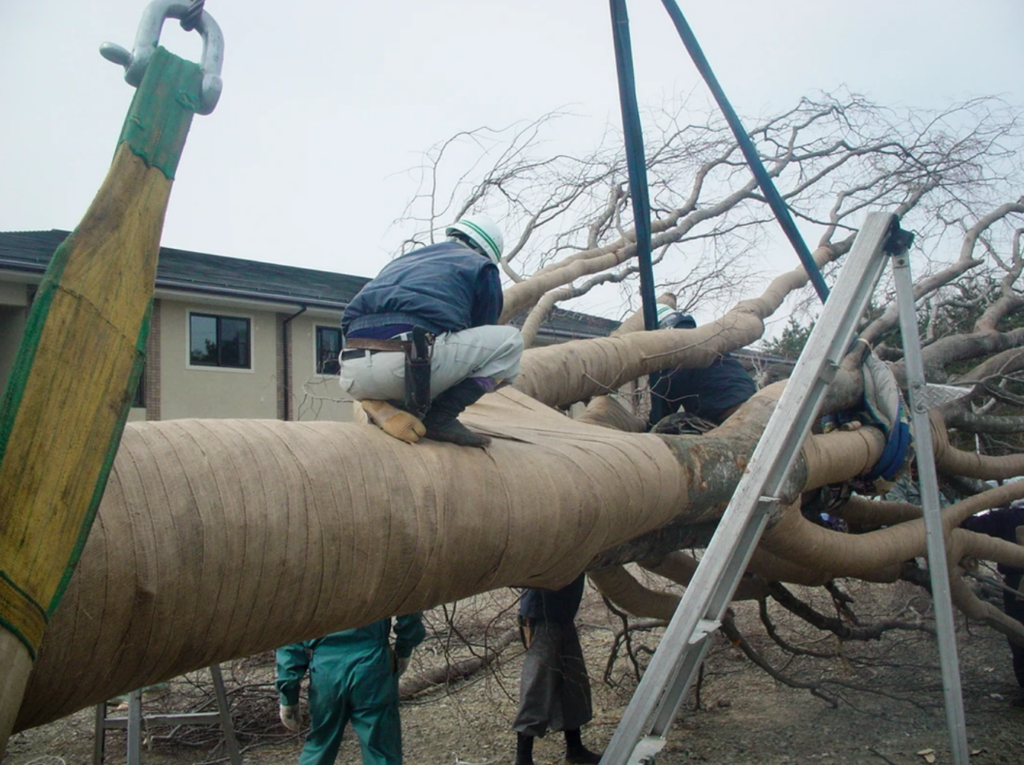 持ってくることももちろん大変ではあるのですが、実は持ってきた後がまた大変。結束を解き、寝ているところから起こす際にも帯掛けの当たる部分に緩衝材となる板を巻いたりするなど、細心の注意が必要です。1日がかりでまっすぐに立てられたとのケヤキは、そんな苦労の甲斐あり非常に美しくシンボリックな存在感を放っています。
