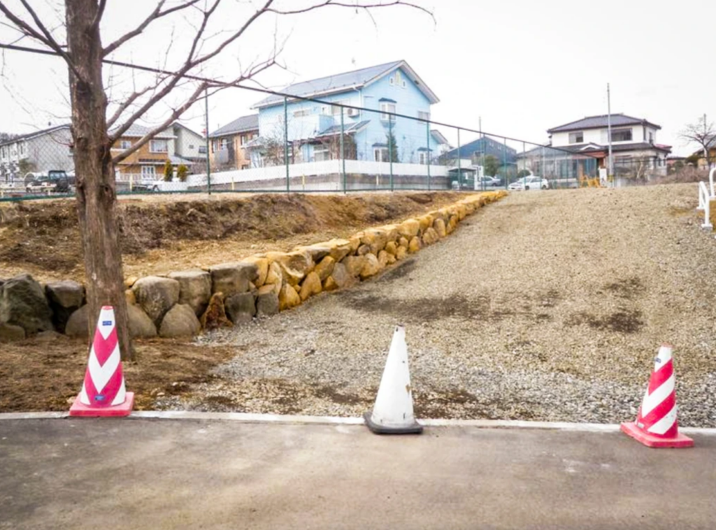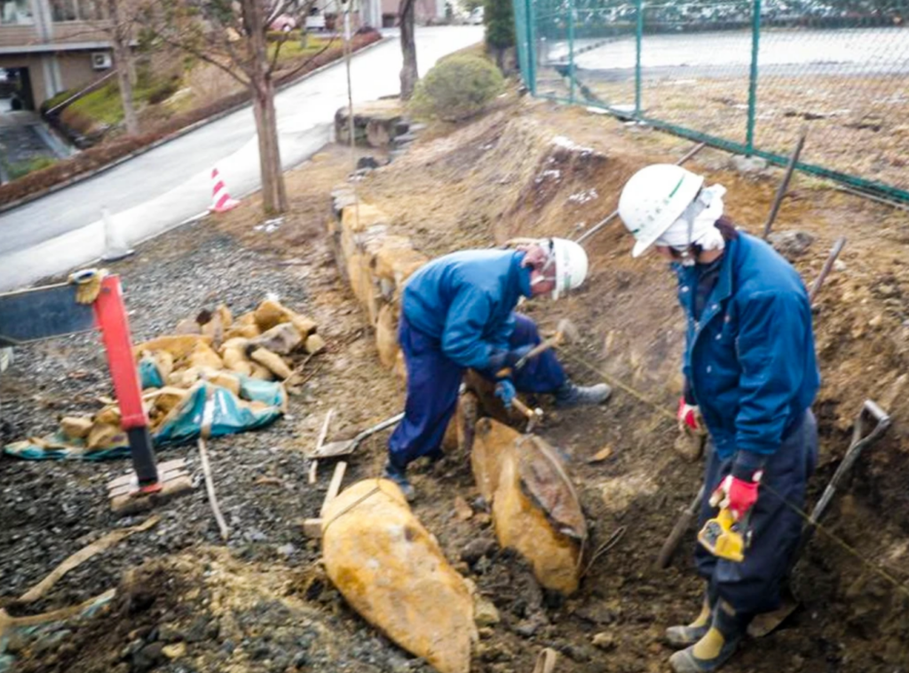 掘ったばかりの石なのでまだ土の色をしています。ここから経年変化によって既存の石と色が馴染んでいきます。
