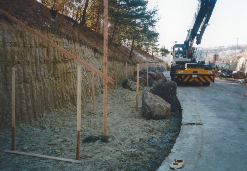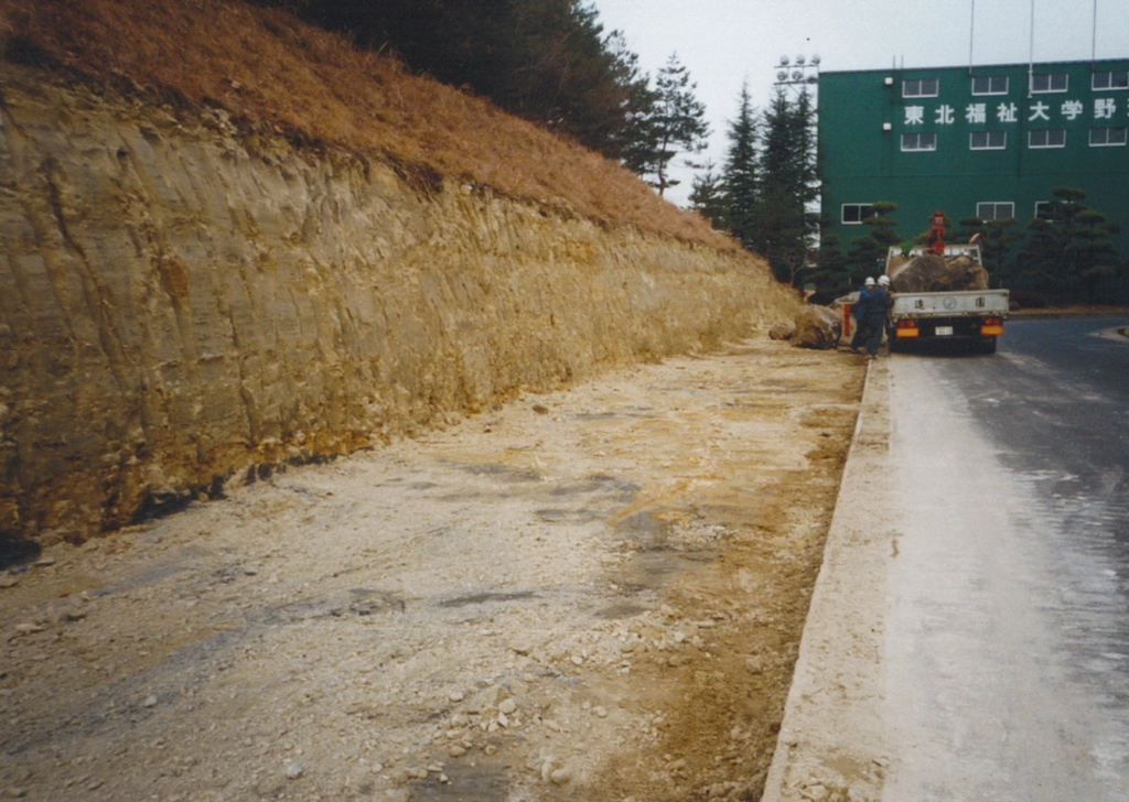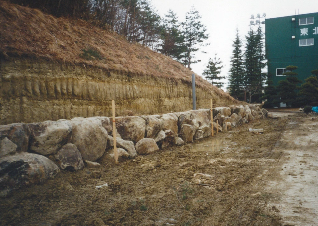 ‘通路拡張に伴う石積みの現場’です。東北福祉大学第二キャンパスには野球場があるのですが、仙台6大学の野球大会会場にもなる規模の球場なんですね。大会当日ともなれば仙台全域から学生や親族の方々がお越しになります…そう、駐車場が足りなくなるほどに。その為、20台追加で駐車できるように造成を行いました。