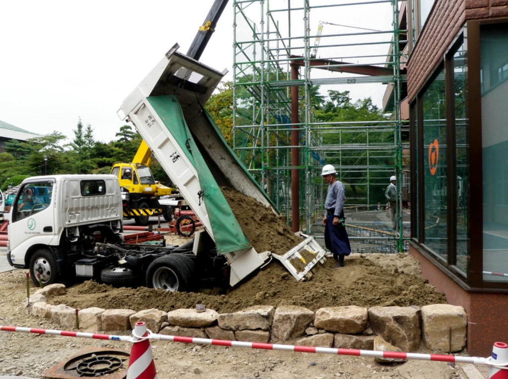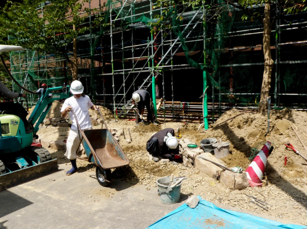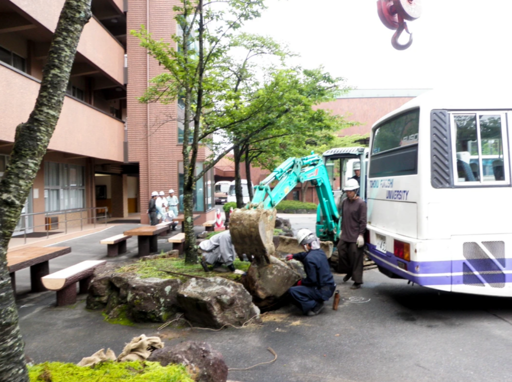 サクラの根元の石積みの解体しバラした石は校外に搬出します。