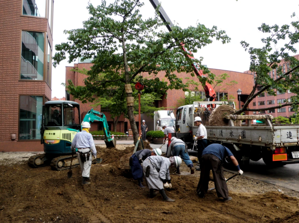 サクラを掘り取り根巻を行います。いくら急ぎとは言え手を抜くと枯れてしまい仕事したのがむだになりますので、注意が必要です。