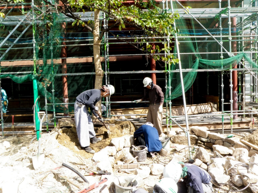 この現場はʼ野⾯積みʼという技法で積んであります。カーブを付け、さらに⾼低差がある⽯積みに…といったご要望でした。カーブには⼤きな⽯は適さないので、⼩さな⽯をモルタルで固定して仕上げています。なかなか珍しく難しい⽯積みです。