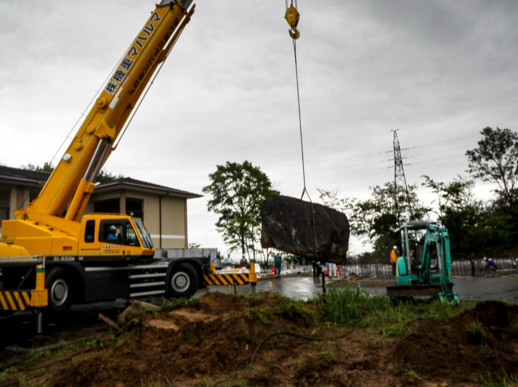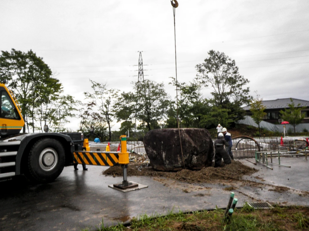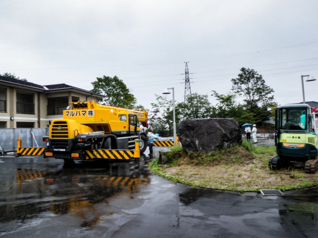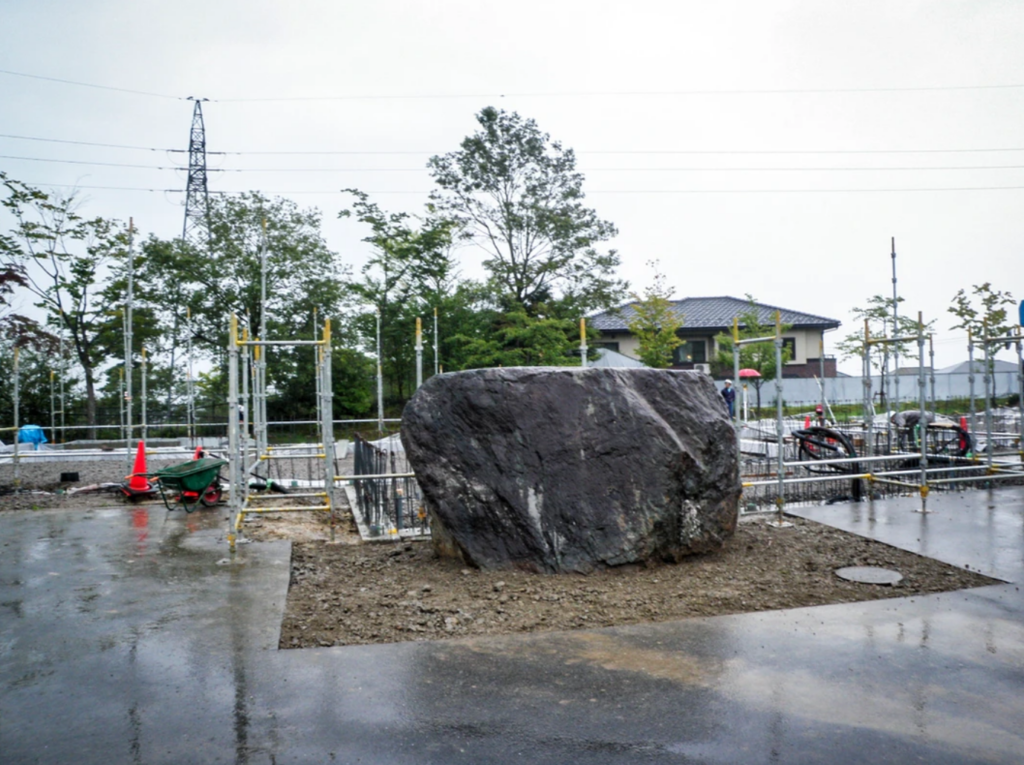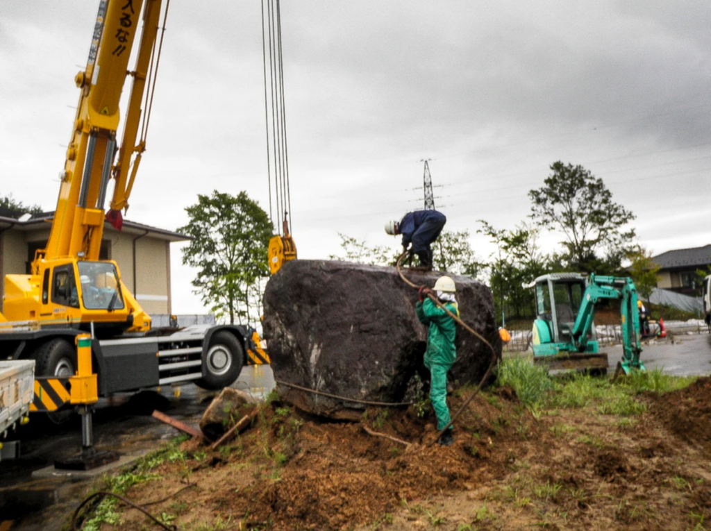 現場は、東北福祉大学の寮の敷地内。その年は新しい寮が一棟増築されるとの事で、玄関前となる場所に庭石を移設する運びとなったそうです。「私が経験した現場の中でも‘最も大きな庭石移設’でございました。高さ2メートル・幅3メートル、その重さ25トンもの巨大な庭石です。トラック・クレーン・ワイヤー…全てを完全な状態で整えておかなければ絶対に動かすことはできません。」