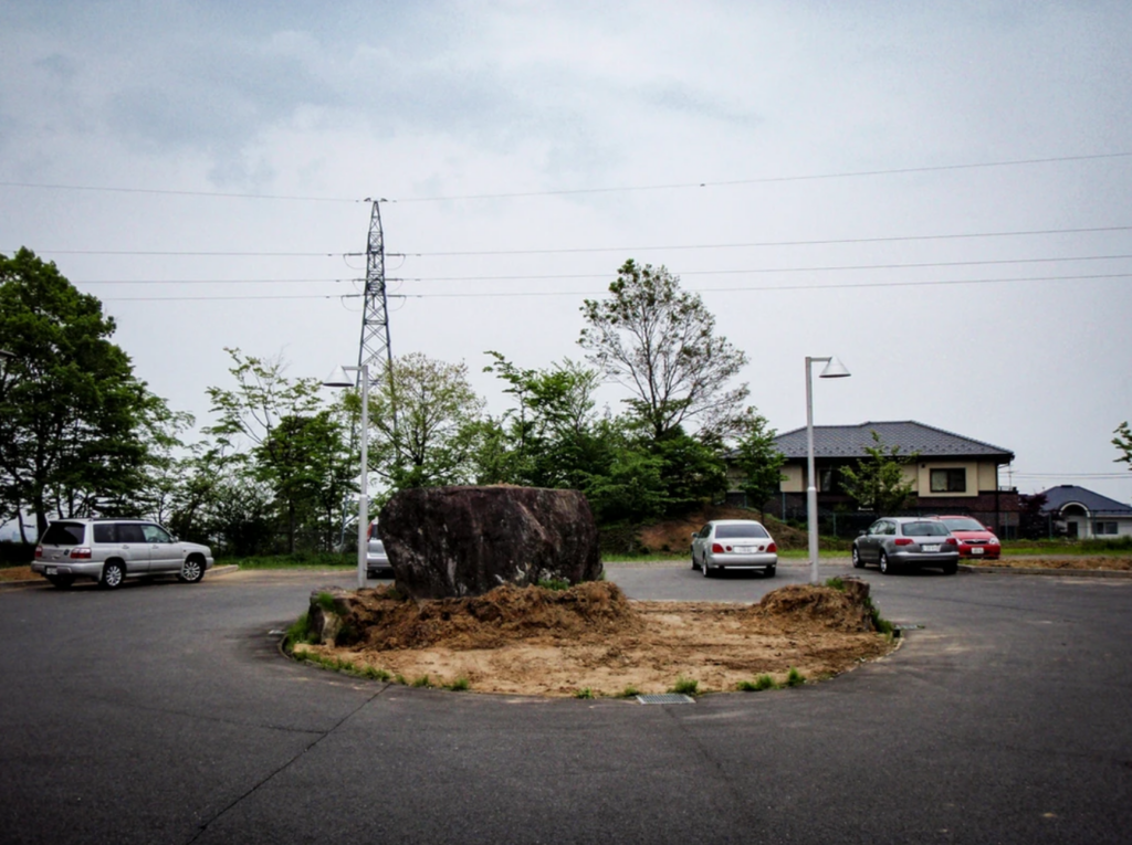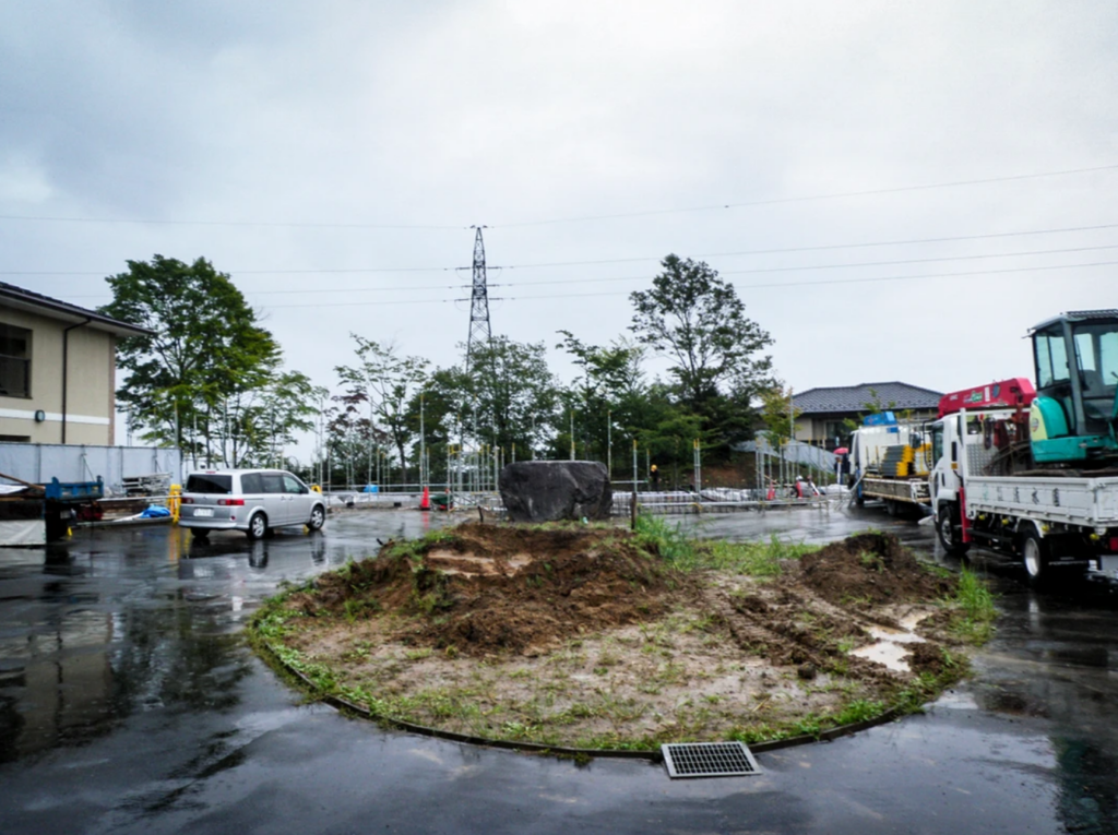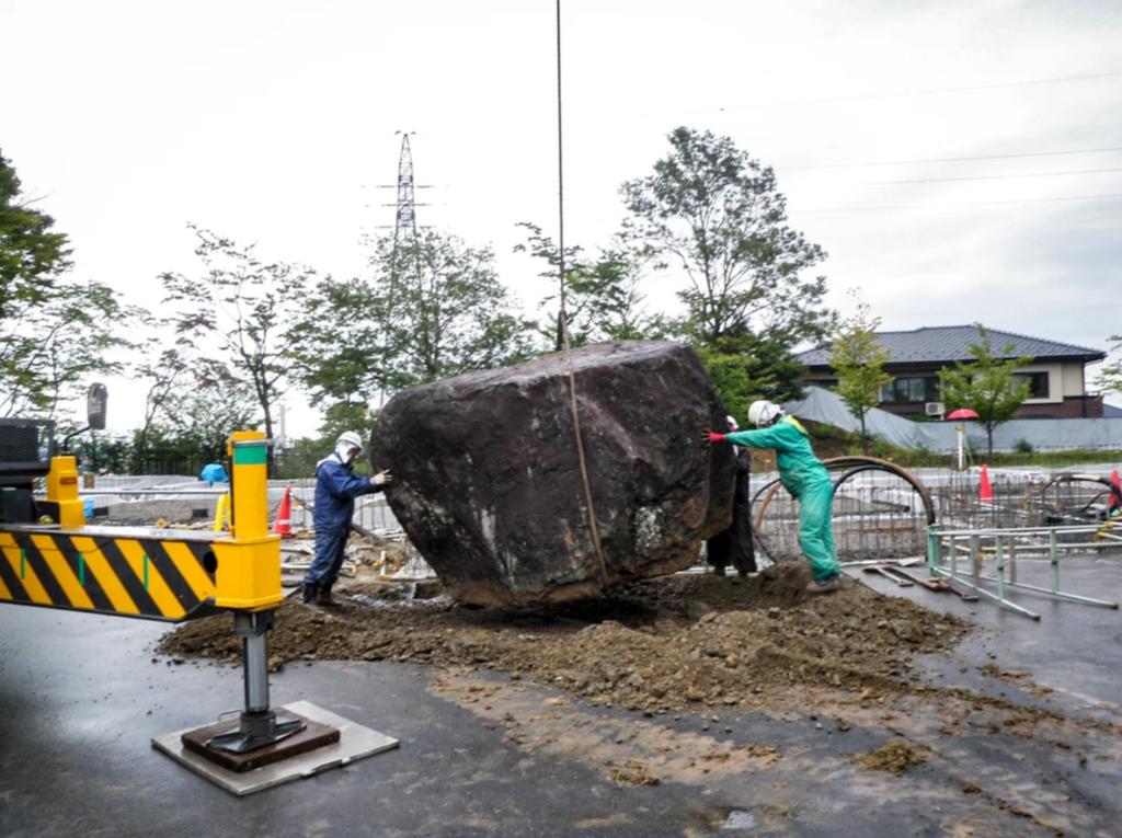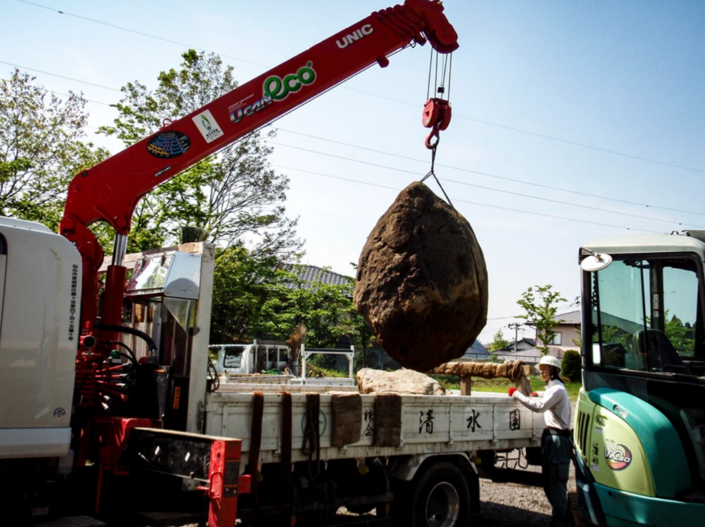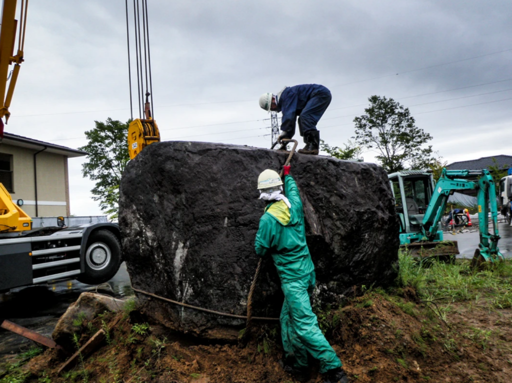 現場は、東北福祉大学の寮の敷地内。その年は新しい寮が一棟増築されるとの事で、玄関前となる場所に庭石を移設する運びとなったそうです。「私が経験した現場の中でも‘最も大きな庭石移設’でございました。高さ2メートル・幅3メートル、その重さ25トンもの巨大な庭石です。トラック・クレーン・ワイヤー…全てを完全な状態で整えておかなければ絶対に動かすことはできません。」