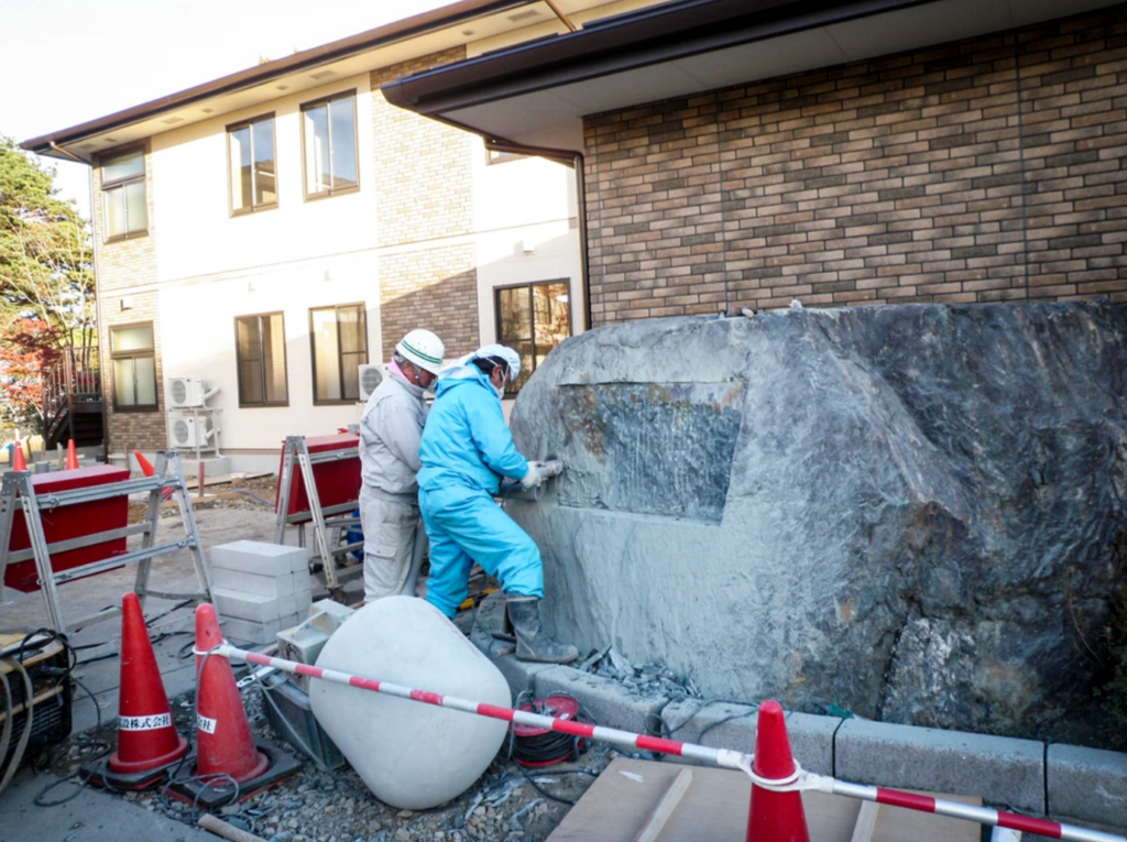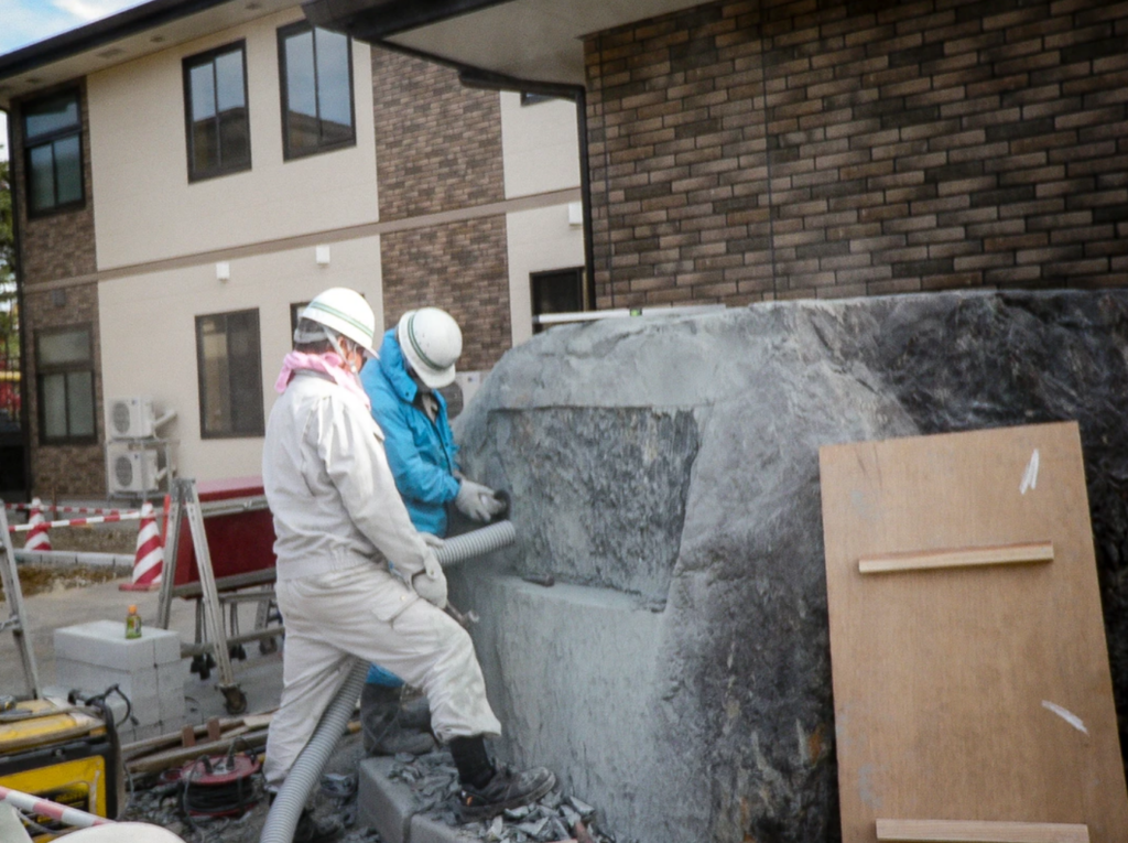 庭石は、鮫川石という福島県で採れる石で三代名石のうちの一つ。その大きさと存在感はもちろんのこと、鮫川石特有の青さや、雨に濡れると艶やかでとても美しい表情を見せてくれます。「やはり象徴的な石ですから…こういった形で日の目を見るのは造園家としても喜ばしい限りです。移設後は看板を石にはめるとのことで、サンダーを使用して石を掘り進め、2人がかりで3日かけ掘り上げました。色々な意味で貴重で思い出深い現場でしたね。」