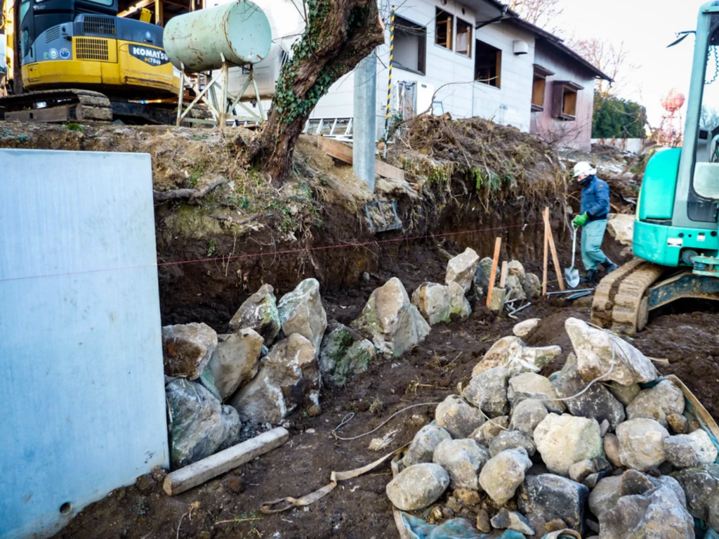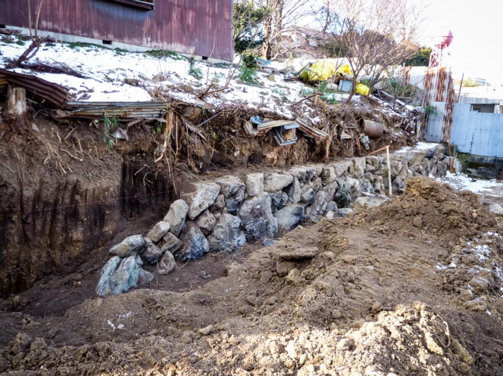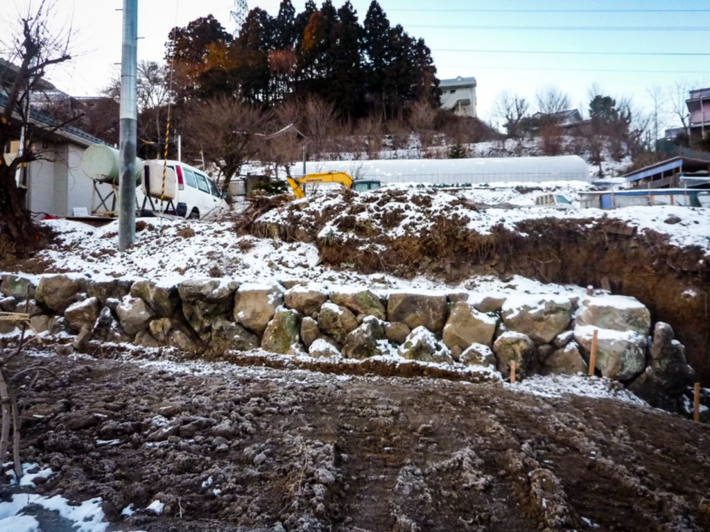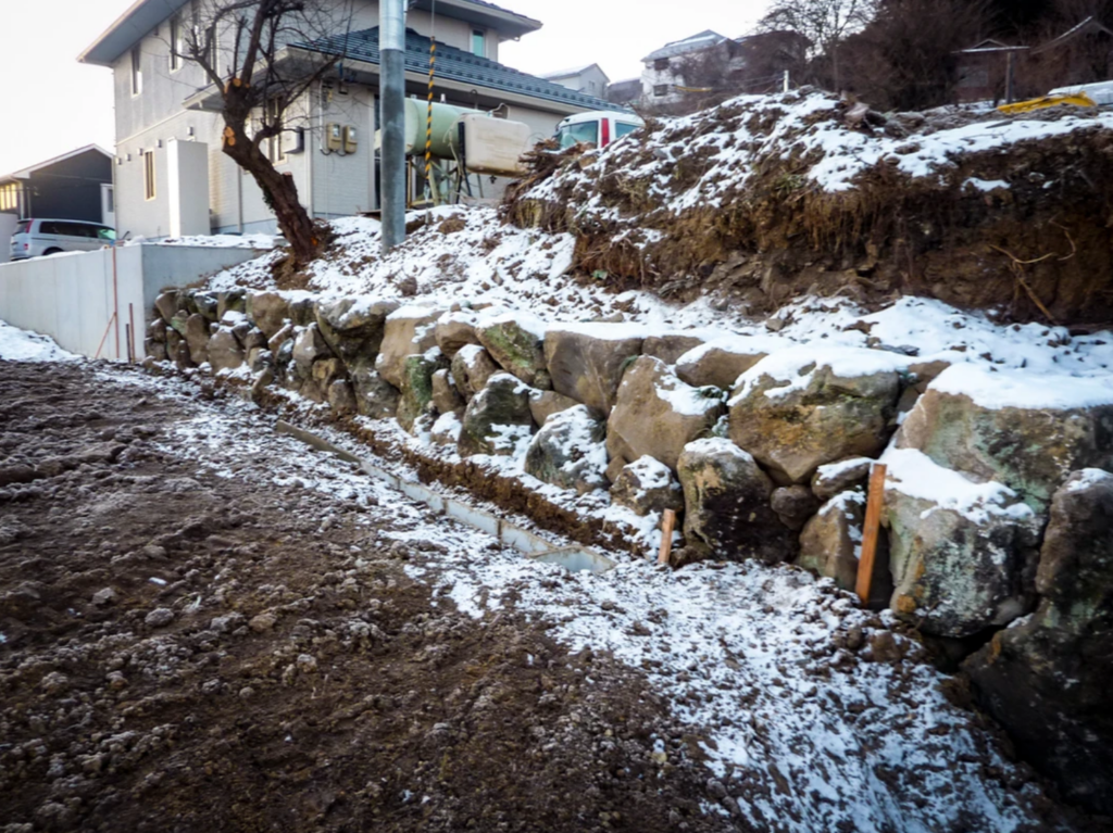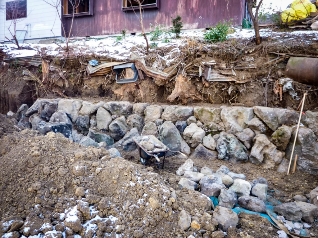 地続きだった敷地の区分け(石積み・土留)において、庭の解体現場から出た庭石を使用しました。
