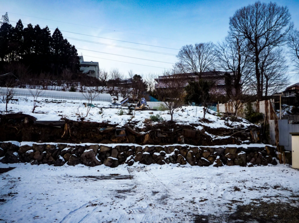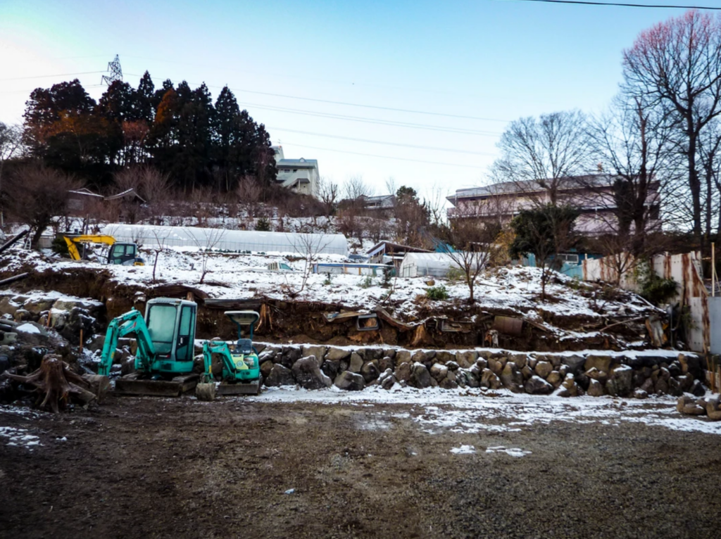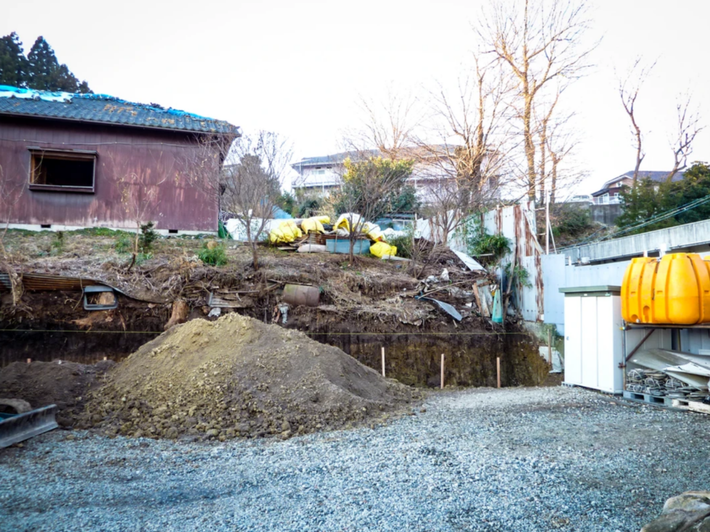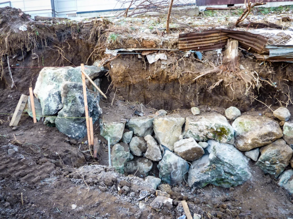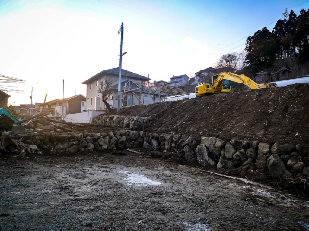 地続きだった敷地の区分け(石積み・土留)において、庭の解体現場から出た庭石を使用しました。