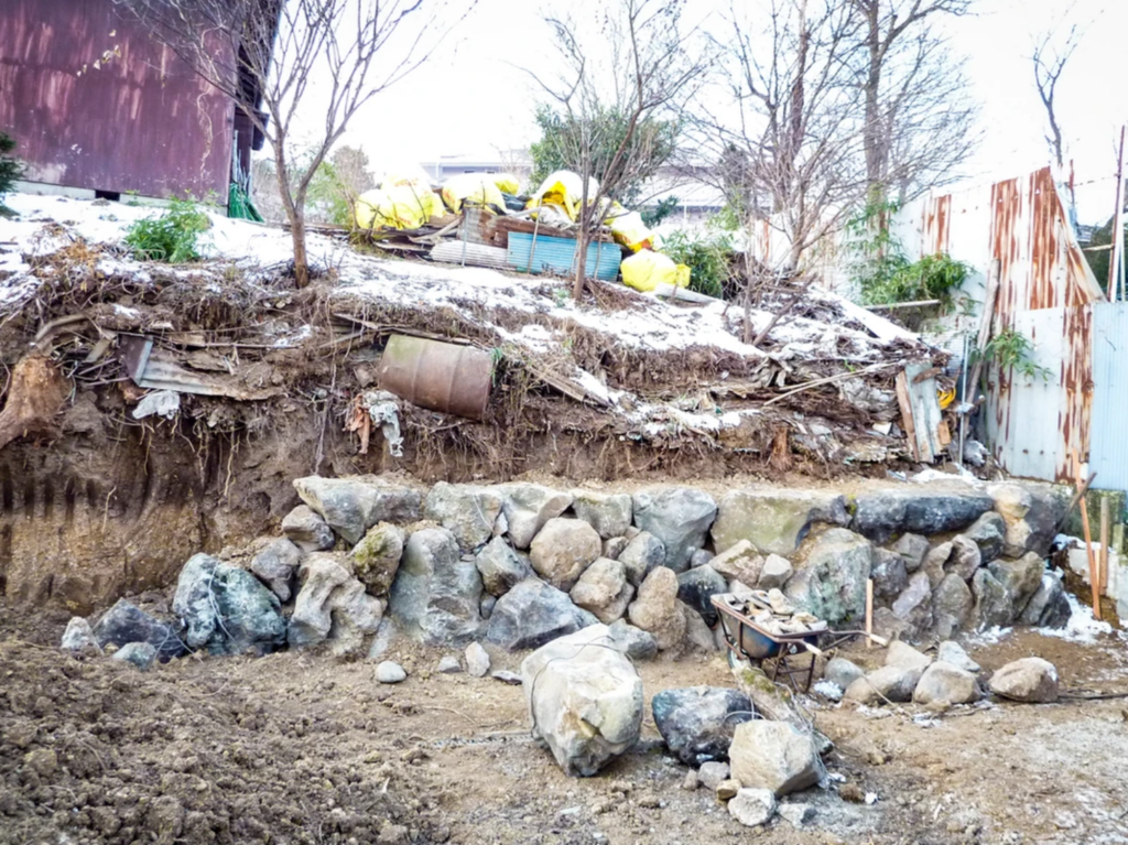 お隣さんの石積みは「今後高く積みなおせるよう」に積んであり、将来が楽しみな現場である事に加えて造園家である代表の自宅から必ず見える位置にあります。