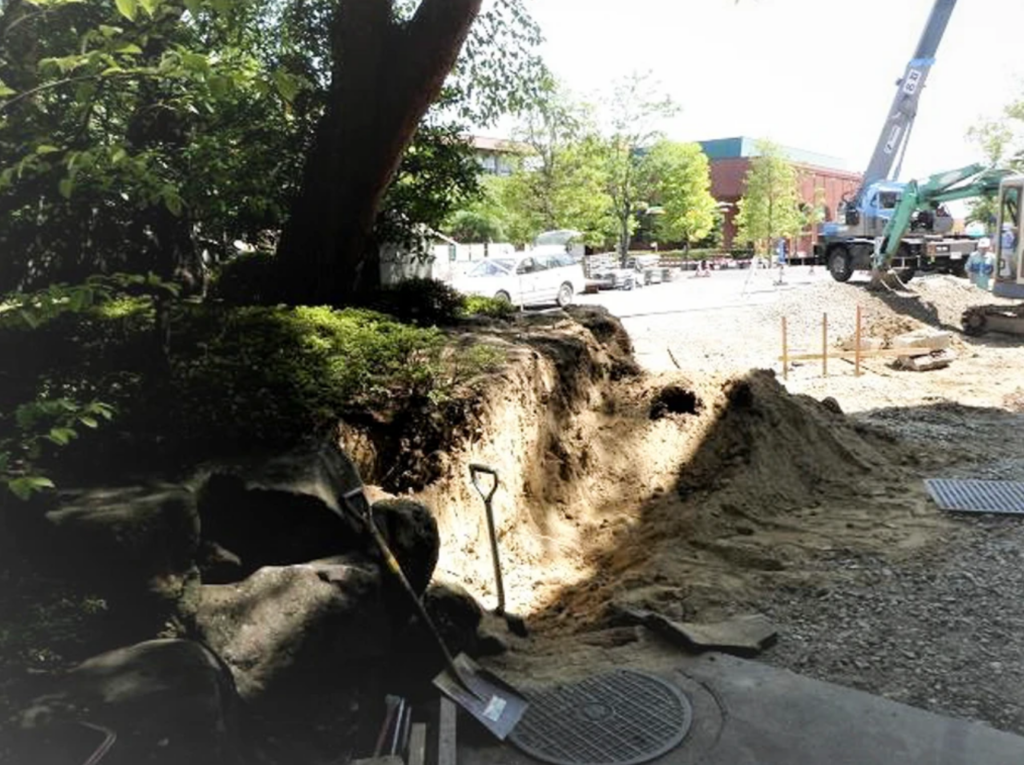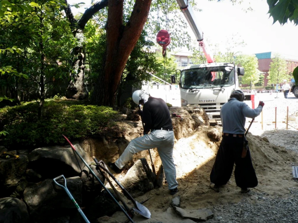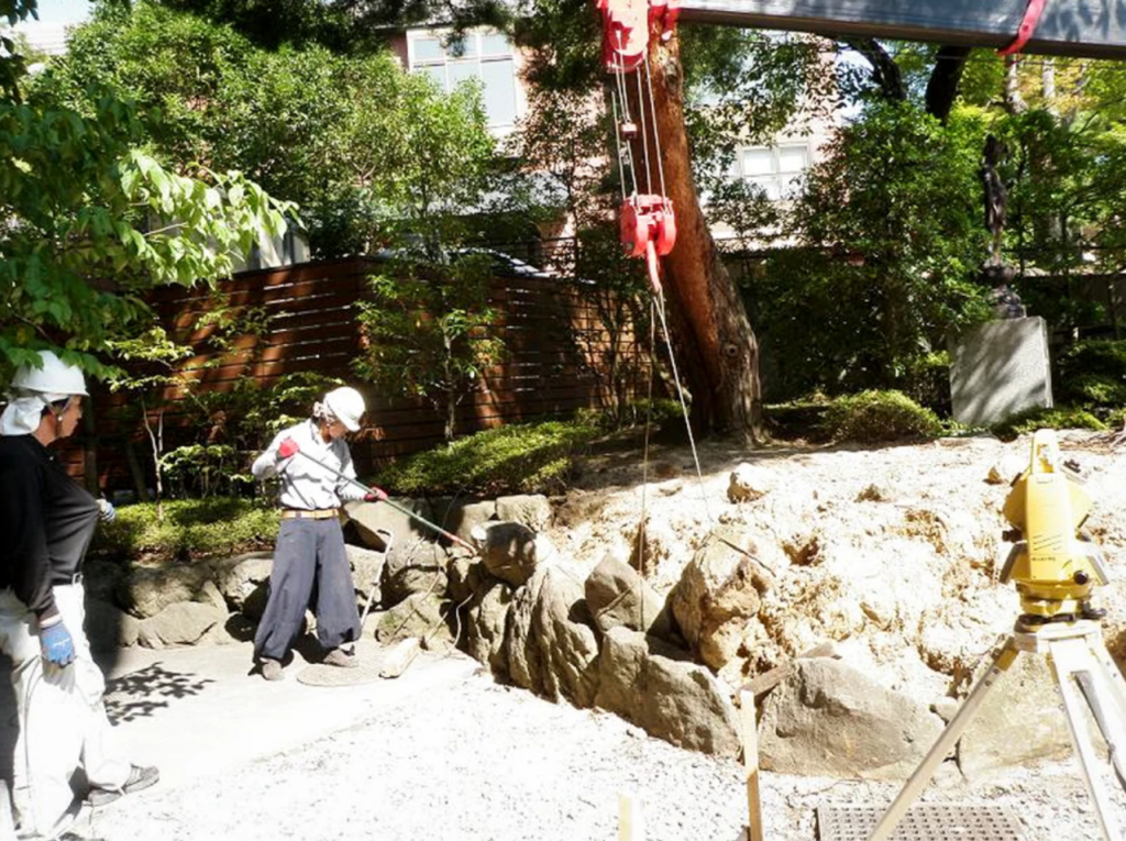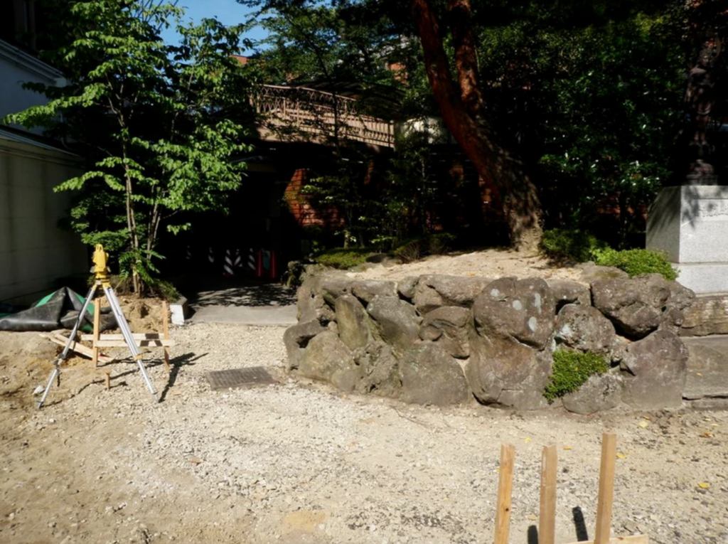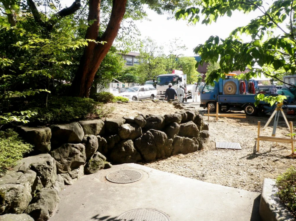 東北福祉大学 国見キャンパスの石積みは、初代から手掛けていた現場です。この時は、敷地内に新しい建物が立つため通路が狭くなりリヤカーが通れなくなる…というので、通路幅を拡張するために石の積み直しを行いました。積み直しの場合はいくつか気をつけなければならない点がございます。