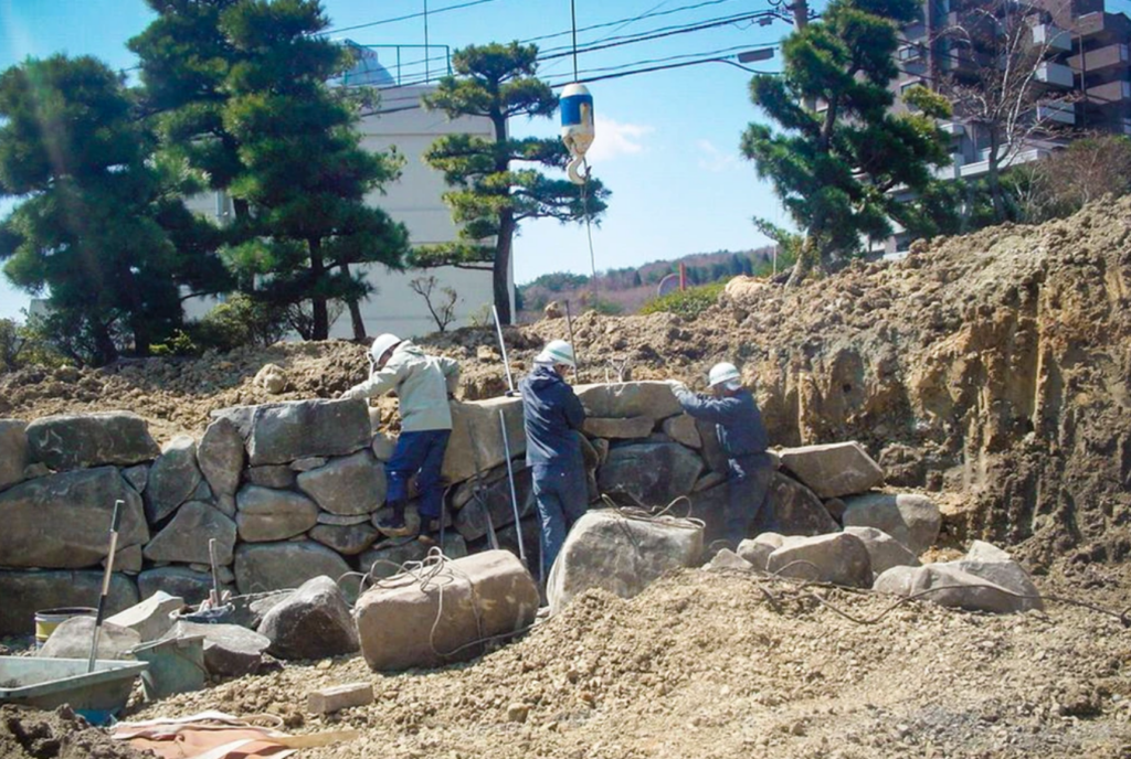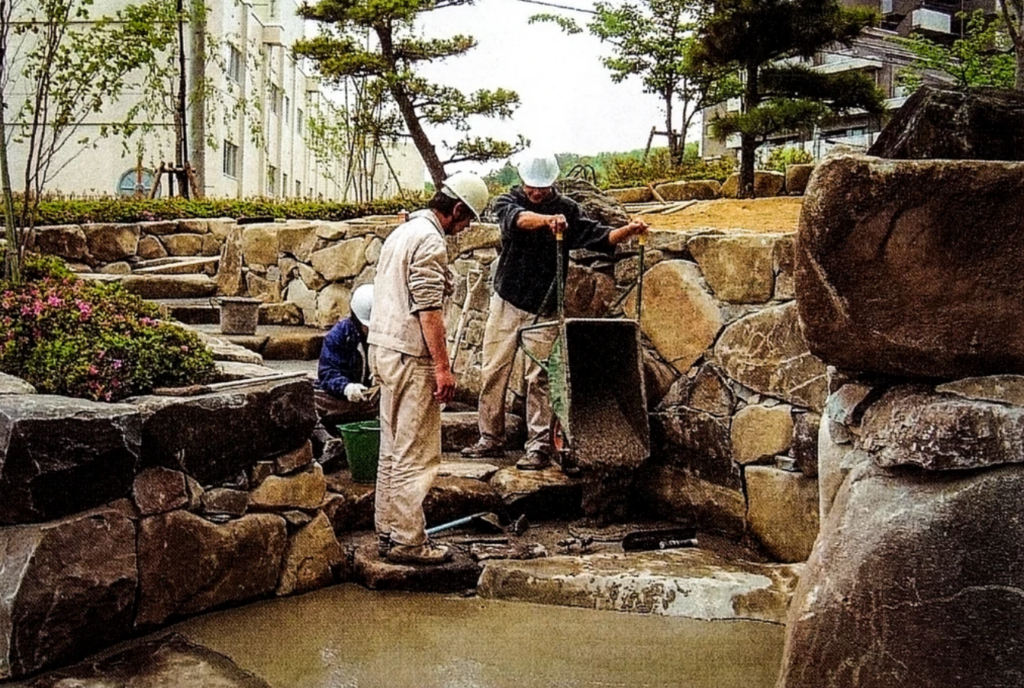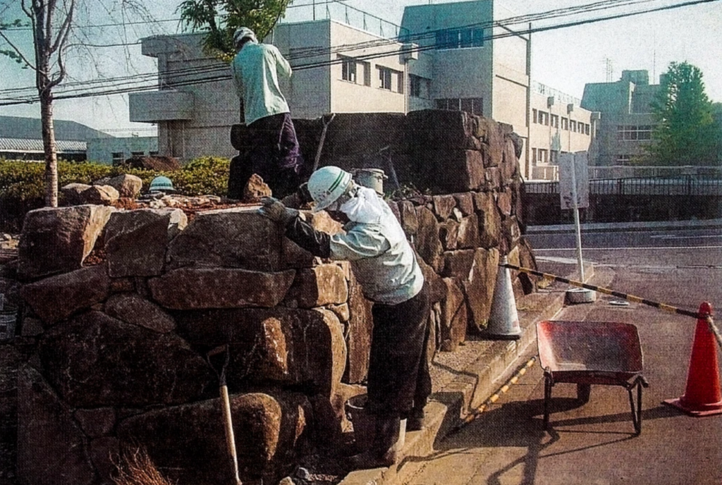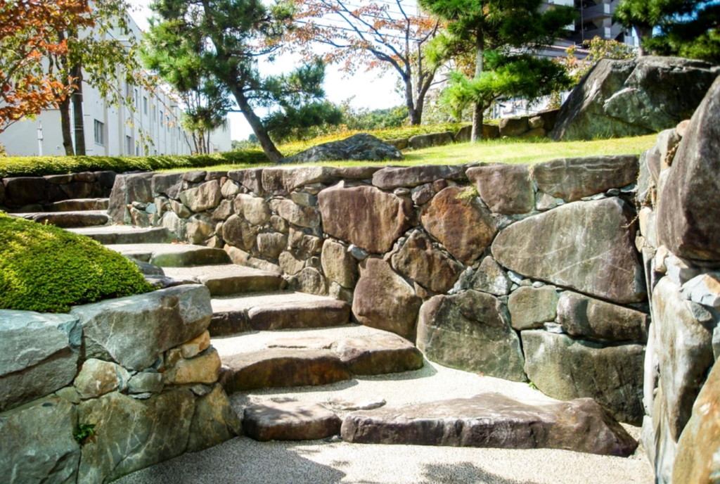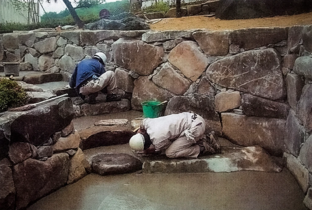 代表にとって「初めての野面積み」となった、東北福祉大学内の施設・ウェルコム21での事例です。清水園の初代が手掛けた石積みを一部解体し積み直す、といった内容でしたが高い技術力と経験の求められる石積み…当初大変なプレッシャーの中で取り組んだとのこと。ここでは城積み(野面積み)をはじめ、通路施工に伴う階段の設計も手掛けました。