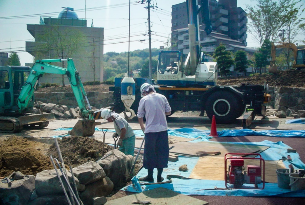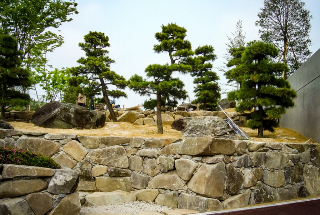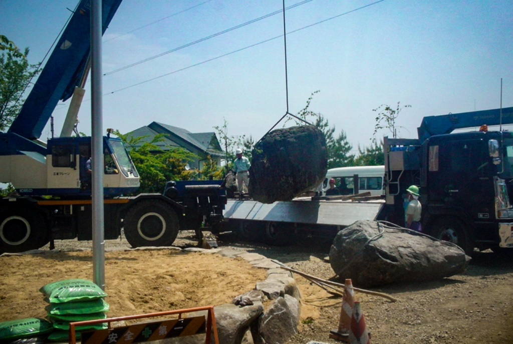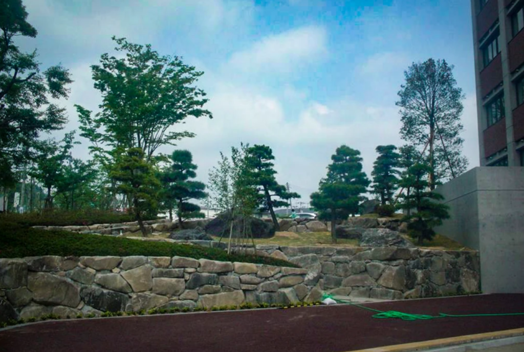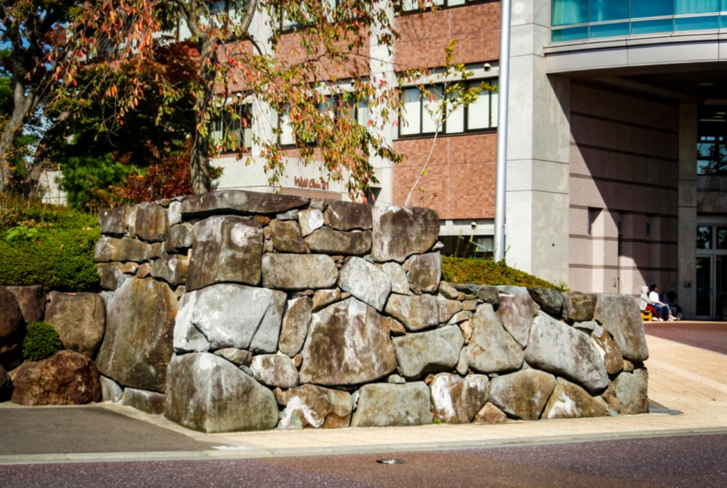 代表にとって「初めての野面積み」となった、東北福祉大学内の施設・ウェルコム21での事例です。清水園の初代が手掛けた石積みを一部解体し積み直す、といった内容でしたが高い技術力と経験の求められる石積み…当初大変なプレッシャーの中で取り組んだとのこと。ここでは城積み(野面積み)をはじめ、通路施工に伴う階段の設計も手掛けました。